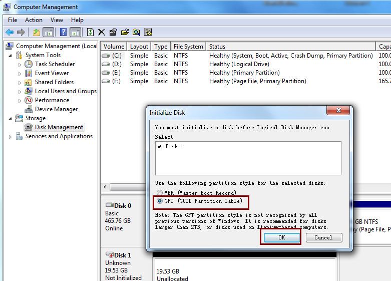 6.Open “Disk Management” on client pc.Choose “GPT” in “Initialize Disk”