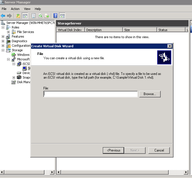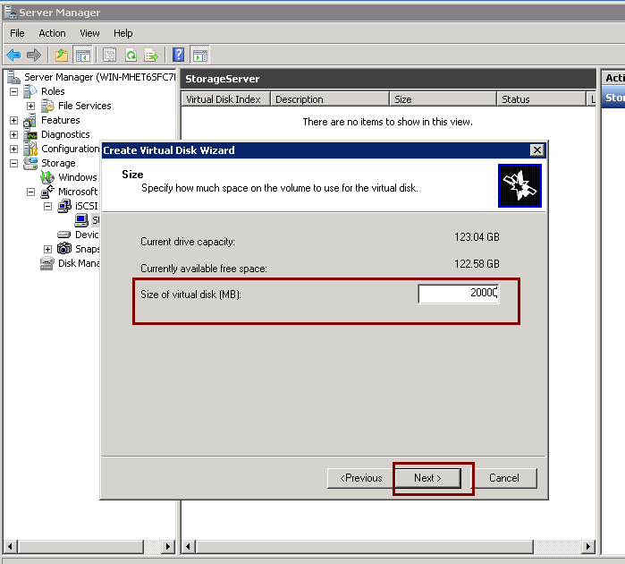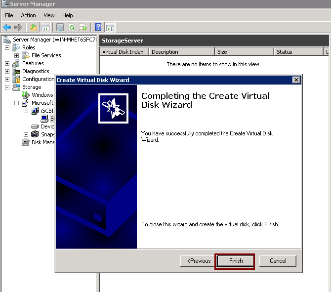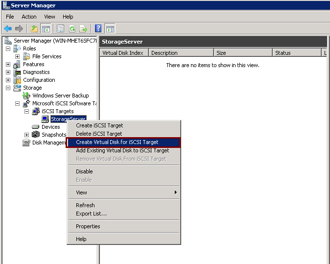 3.Right Click on the new created iscsi target “StorageServer” and choose “Create Vitual Disk for iSCSI Target”